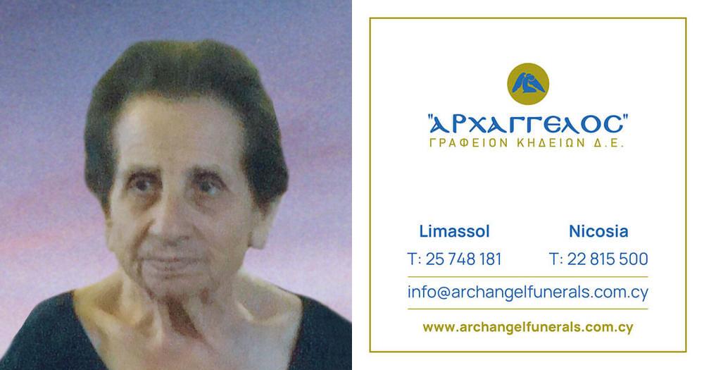 που απεβίωσε στις 22.02.2024, σε ηλικία 85 ετών, κηδεύουμε το Σάββατο 24.02.2024 και ώρα 10:00 π.μ. από τον Ιερό Ναό Αγ. Μηνά στον Άγιο Αθανάσιο στη Λεμεσό και καλούμε όσους τιμούν τη μνήμη της να παραστούν.