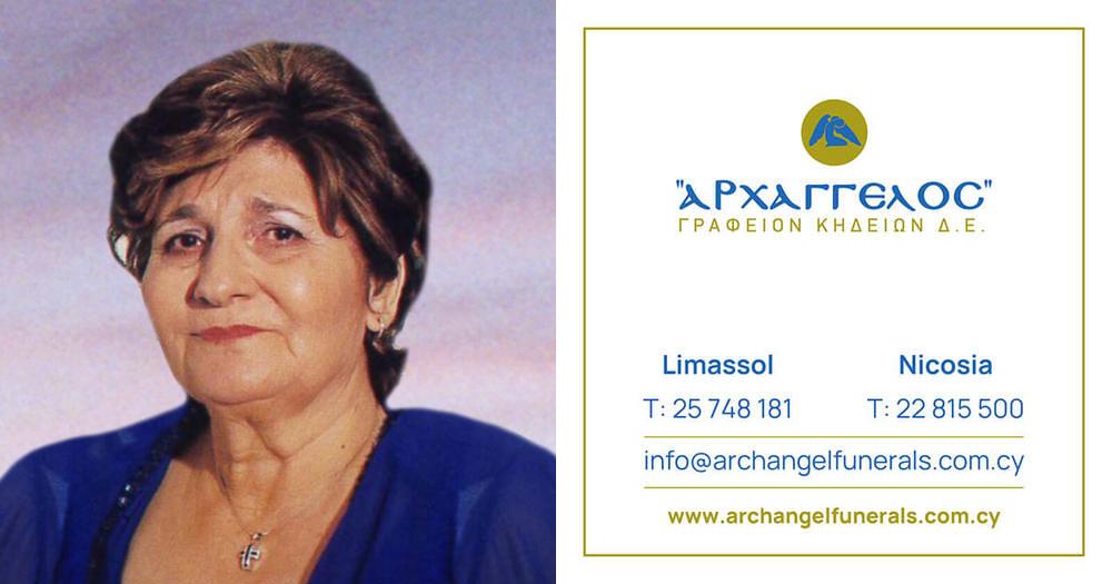 που απεβίωσε την Πέμπτη 28.03.2024, σε ηλικία 85 ετών, κηδεύουμε αύριο Σάββατο 30.03.2024 και ώρα 10:00 π.μ. από τον Ιερό Ναό Αγίας Ζώνης στη Λεμεσό και καλούμε όσους τιμούν τη μνήμη της να παραστούν.
