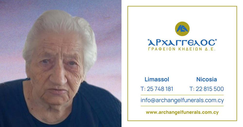 που απεβίωσε την Πέμπτη 7.3.2024, σε ηλικία 88 ετών, κηδεύουμε το Σάββατο 9.3.2024 και ώρα 10:00 π.μ. από τον Ιερό Ναό Αγίας Μαρίνας στο Συνοικισμό Καψάλου, Λεμεσό και καλούμε όσους τιμούν τη μνήμη της να παραστούν.