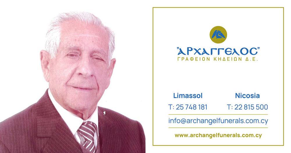 που απεβίωσε την Πέμπτη 10.04.2025, σε ηλικία 95 ετών, κηδεύουμε το Σάββατο 12.04.2025 και ώρα 11:30 π.μ. από τον Ιερό Ναό Προφήτη Ηλία Ποταμού Γερμασόγειας στη Λεμεσό και καλούμε όσους τιμούν τη μνήμη του να παραστούν.