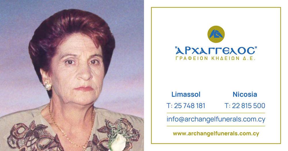 που απεβίωσε την Δευτέρα 04.11.2024, σε ηλικία 84 ετών, κηδεύουμε τη Πέμπτη 07.11.2024 και ώρα 2:00 μ.μ. από τον Ιερό Ναό Αγίου Κοσμά του Αιτωλού (κοιμητήριο Σφαλαγγιώτισσας) στη Λεμεσό και καλούμε όσους τιμούν τη μνήμη της να παραστούν.
