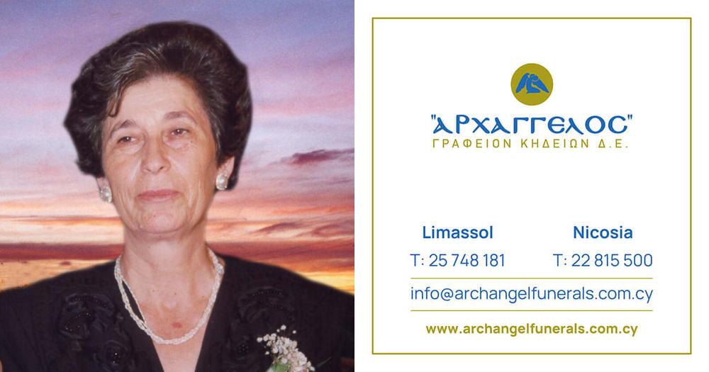που απεβίωσε την Δευτέρα 26.08.2024, σε ηλικία 86 ετών, κηδεύουμε την Τετάρτη 28.08.2024 και ώρα 1:00 μ.μ. από τον Ιερό Ναό Αγίου Κοσμά του Αιτωλού στη Λεμεσό και καλούμε όσους τιμούν τη μνήμη της να παραστούν.