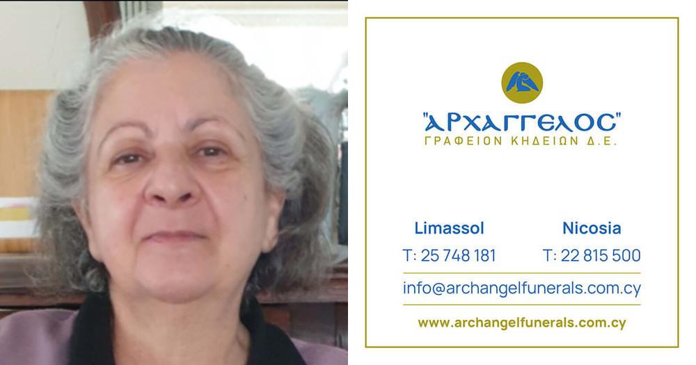 που απεβίωσε την Πέμπτη 04.07.2024,σε ηλικία 64 ετών,κηδεύουμε την Παρασκευή 05.07.2024 και ώρα 11:00 π.μ. από τον Ιερό Ναό Αγ. Κοσμά Αιτωλού (κοιμητήριο Σφαλαγγιώτισσας) στη Λεμεσό και καλούμε όσους τιμούν τη μνήμη της να παραστούν.