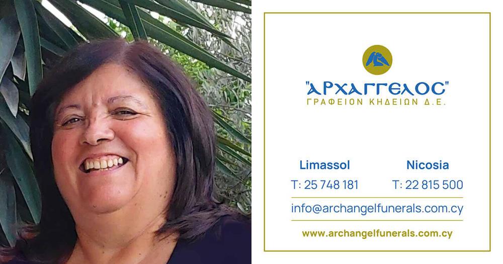 που απεβίωσε τη Δευτέρα 23.06.2025, σε ηλικία 68 ετών, κηδεύουμε την Πέμπτη 26.06.2025 και ώρα 4:30 μ.μ. από τον Ιερό Ναό Αγ.Δημητρίου στην Ακρόπολη, Λευκωσία και καλούμε όσους τιμούν τη μνήμη της να παραστούν.