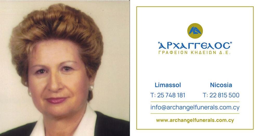 που απεβίωσε την Παρασκευή 20.12.2024, σε ηλικία 80 ετών, κηδεύουμε τη Παρασκευή 27.12.2024 και ώρα 11:30 π.μ. από τον Ιερό Ναό Αγίου Νικολάου στη Λεμεσό και καλούμε όσους τιμούν τη μνήμη της να παραστούν.
