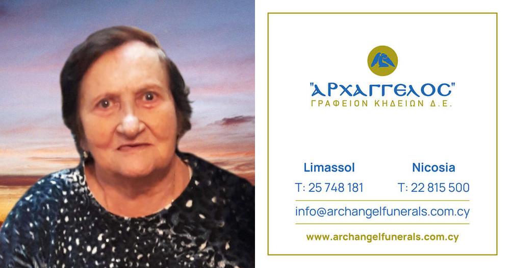 που απεβίωσε στις 23.02.2025, σε ηλικία 88 ετών, κηδεύουμε την Τετάρτη 26.02.2025 και ώρα 12:30 μ.μ. από τον Ιερό Ναό Αγίου Κοσμά Αιτωλού στη Λεμεσό και καλούμε όσους τιμούν τη μνήμη της να παραστούν.