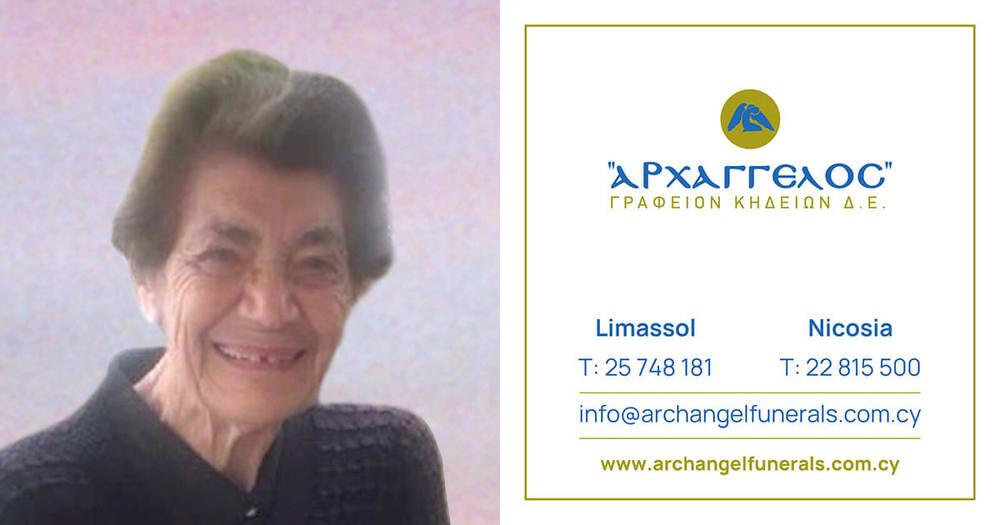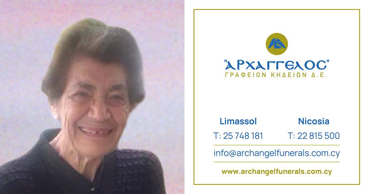 που απεβίωσε στις 12.10.2025 σε ηλικία 93 ετών κηδεύουμε την Τρίτη 14.10.2025 και ώρα 11:00 π.μ. από τον Ιερό Ναό Παναγίας Τριχερούσας στη Λεμεσό και καλούμε όσους τιμούν τη μνήμη της να παραστούν.