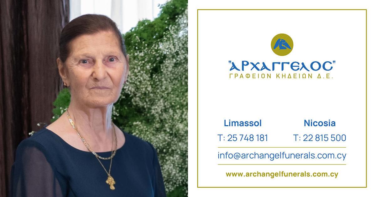 που απεβίωσε στις 23.09.2025 σε ηλικία 82 ετών κηδεύουμε την Πέμπτη 25.09.2025 και ώρα 11:00 π.μ. από τον Ιερό Ναό Αγ.Κοσμά Αιτωλού (κοιμητήριο Σφαλαγγιώτισσας) στη Λεμεσό και καλούμε όσους τιμούν τη μνήμη της να παραστούν.