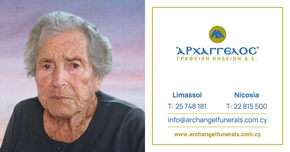 που απεβίωσε την Παρασκευή 09.05.2025, σε ηλικία 93 ετών, κηδεύουμε τη Σαββατο 10.05.2025 και ώρα 12:00 το μεσημέρι από τον Ιερό Ναό Τιμίου Σταυρού (Αγ.Παρθένιο) Πάνω Πολεμιδιών στη Λεμεσό και καλούμε όσους τιμούν τη μνήμη της να παραστούν.