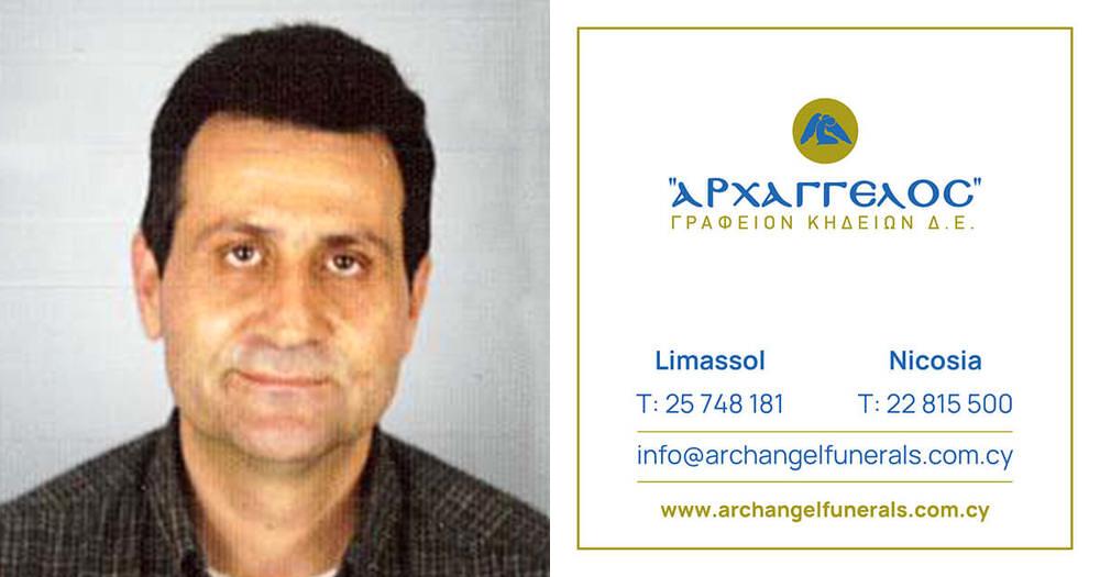 που απεβίωσε στις 09.01.2025, σε ηλικία 63 ετών, κηδεύουμε την Παρασκευή 10.01.2025 και ώρα 3:00 μ.μ. από τον Ιερό Ναό Απ.Ανδρέα και Οσίας Φωτεινής στο Συνοικισμό Κολοσσίου στη Λεμεσό και καλούμε όσους τιμούν τη μνήμη του να παραστούν.
