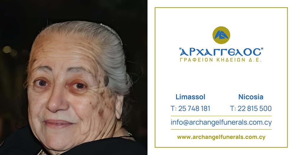 που απεβίωσε το Σάββατο 20.01.2024 , σε ηλικία 84 ετών κηδεύουμε την Τρίτη 23.01.2024 και ώρα 11:00 π.μ από τον Ιερό Ναό Παναγίας Χρυσοπλατυτέρας στην Παραμύθα Λεμεσού και καλούμε όσους τιμούν τη μνήμη της να παραστούν.