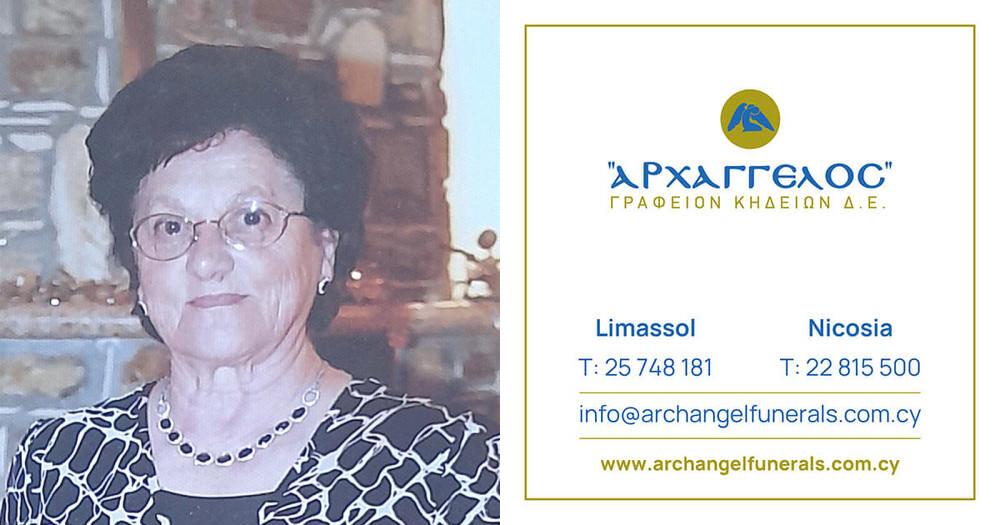 που απεβίωσε την Παρασκευή 22.03.2024, σε ηλικία 87 ετών, κηδεύουμε την Τρίτη 26.03.2024 και ώρα 2:00 μ.μ. από τον Ιερό Ναό Αγίου Νικολάου στη Λεμεσό και καλούμε όσους τιμούν τη μνήμη της να παραστούν.