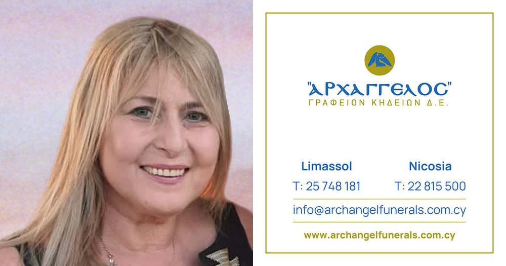 που απεβίωσε στις 08.01.2026 σε ηλικία 62 ετών κηδεύουμε τη Δευτέρα 12.01.2026 και ώρα 12:30 μ.μ. από τον Ιερό Ναό Αγίου Κοσμά Αιτωλού (κοιμητήριο Σφαλαγγιώτισσας) στη Λεμεσό και καλούμε όσους τιμούν τη μνήμη της να παραστούν.