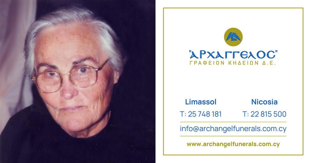 που απεβίωσε στις 03.11.2025 σε ηλικία 94 ετών κηδεύουμε την Τετάρτη 05.11.2025 και ώρα 2:00 μ.μ. από τον Ιερό Ναό Παναγίας Χαρίτων στη Λευκωσία και καλούμε όσους τιμούν τη μνήμη της να παραστούν.