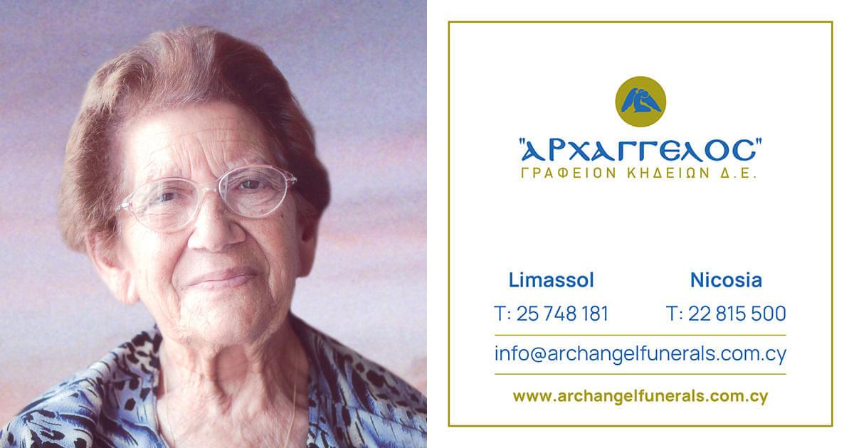 που απεβίωσε στις 31.10.2025 σε ηλικία 90 ετών κηδεύουμε την Τρίτη 04.11.2025 και ώρα 11:00 π.μ. από τον Ιερό Ναό Αγ.Κοσμά Αιτωλού (κοιμητήριο Σφαλαγγιώτισσας) στη Λεμεσό και καλούμε όσους τιμούν τη μνήμη της να παραστούν.