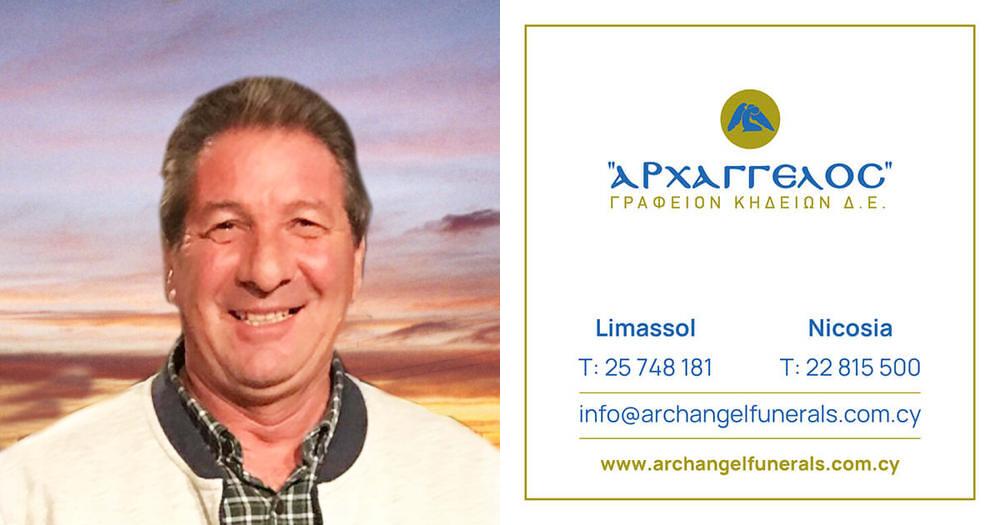 που απεβίωσε στις 24.8.2023, σε ηλικία 65 ετών, κηδεύουμε την Πέμπτη 31.8.2023 και ώρα 1:00 μ.μ. από τον Ιερό Ναό Αγίου Μηνά στον Άγιο Αθανάσιο στη Λεμεσό και καλούμε όσους τιμούν τη μνήμη του να παραστούν.