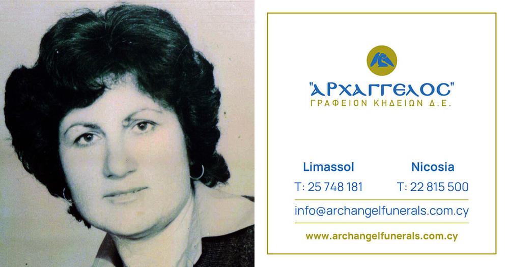 που απεβίωσε τη Δευτέρα 14.07.2025, σε ηλικία 84 ετών, κηδεύουμε την Τετάρτη 16.07.2025 και ώρα 2:00 μ.μ. από τον Ιερό Ναό Αποστόλου Ανδρέα Χαράκη στη Λεμεσό και καλούμε όσους τιμούν τη μνήμη της να παραστούν.