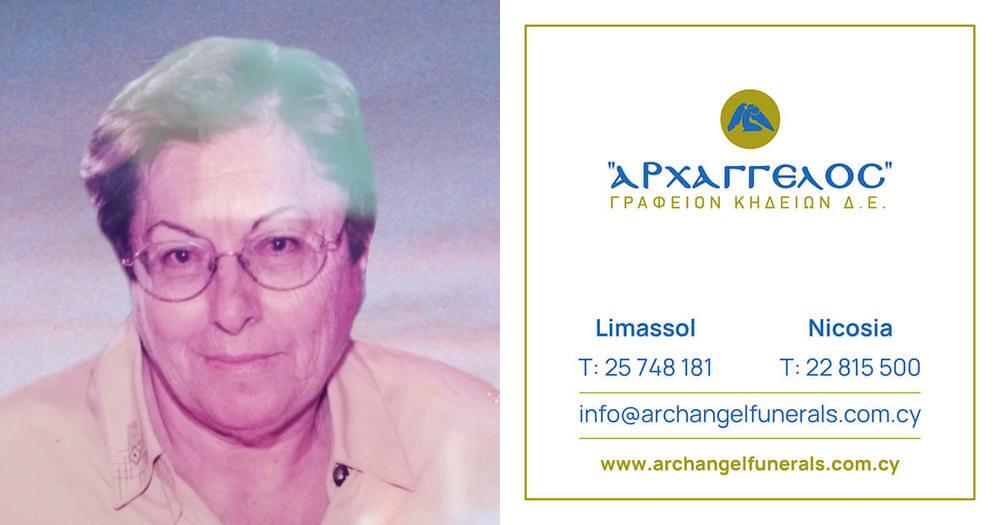 που απεβίωσε στις 13.02.2025, σε ηλικία 82 ετών, κηδεύουμε τη Δευτέρα 17.02.2025 και ώρα 12:30 μ.μ. από τον Ιερό Ναό Αγίου Κοσμά Αιτωλού (κοιμητήριο Σφαλαγγιώτισσας) στη Λεμεσό και καλούμε όσους τιμούν τη μνήμη της να παραστούν.
