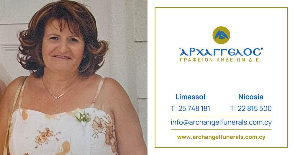 που απεβίωσε την Πέμπτη 12.12.2024, σε ηλικία 69 ετών,κηδεύουμε το Σάββατο 14.12.2024 και ώρα 10:00 π.μ. από τον Ιερό Ναό Αγίου Γεωργίου στα Λατσιά, Λευκωσία και καλούμε όσους τιμούν τη μνήμη της να παραστούν.